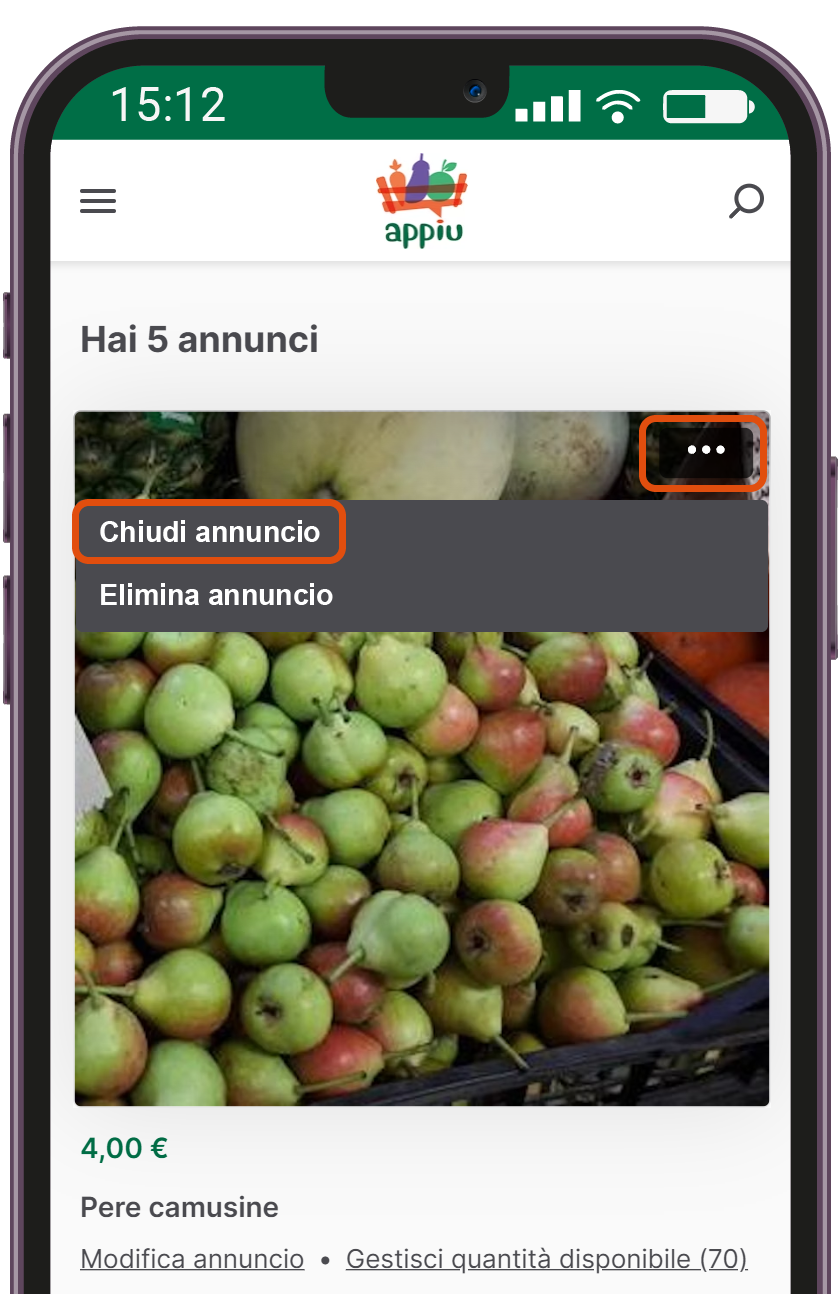 Trova l'annuncio che desideri chiudere, clicca sui tre puntini in alto a destra dell'immagine del prodotto, e seleziona “Chiudi annuncio”.