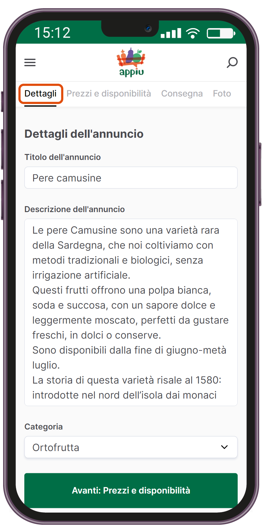 Prima di tutto inserisci il Titolo dell'annuncio scrivendo il nome del prodotto in maniera chiara e specifica. Ad esempio, “Pere camusine”.