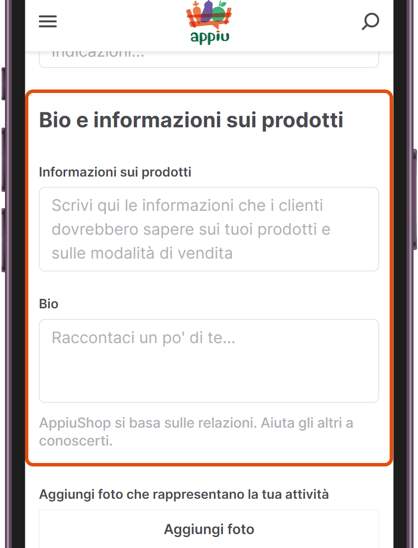 Nella sezione “Bio”, scrivi una breve descrizione della tua azienda.