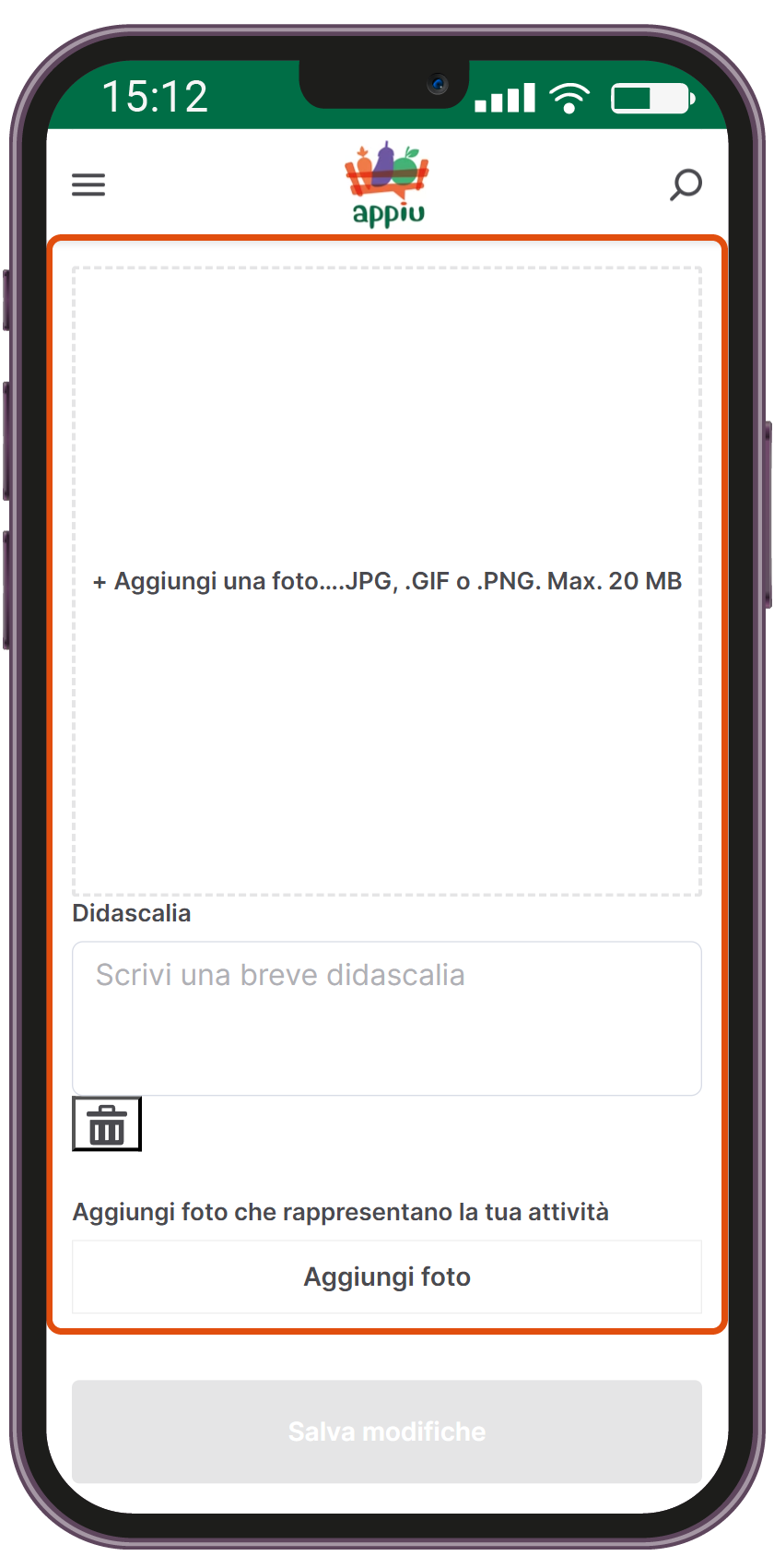 Nella sezione “Aggiungi foto che rappresentano la tua attività”, puoi aggiungere foto della tua azienda e dei tuoi prodotti. Clicca su “Aggiungi foto” e successivamente sul riquadro “+ Aggiungi una foto….JPG, .GIF o .PNG. Max. 20 MB” per caricare immagini dal tuo computer o smartphone, oppure scattarle direttamente da smartphone. Utilizzare foto di alta qualità e ben illuminate aiuta a presentare al meglio la tua produzione e a creare un'immagine professionale della tua attività. Le immagini daranno ai clienti una migliore comprensione dei prodotti e del contesto in cui vengono realizzati.